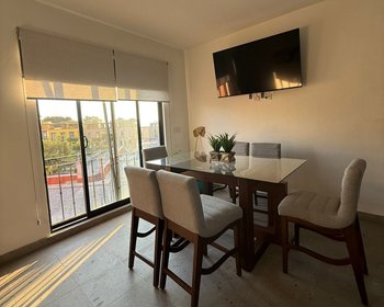 El apartamento tiene un estilo sencillo y contemporáneo. Ubicado en el 3er nivel, cuenta con 2 habitaciones con camas King Size, cuenta con una terraza con vista a los jardines comunitarios sin perder privacidad. La cocina está equipada de forma básica.