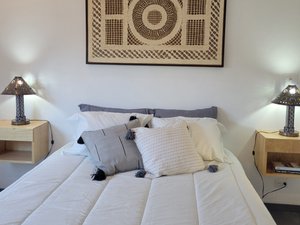 La casita está amueblada y cuenta con un hermoso techo de bóveda, una cama tamaño queen, armario, televisión por cable y un gran ventanal con vista a un patio interior y una fuente. Hay una amplia cocina totalmente equipada y sala de estar con tragaluces. También hay un baño completo con ducha y mucho espacio de almacenamiento en un enorme vestidor.