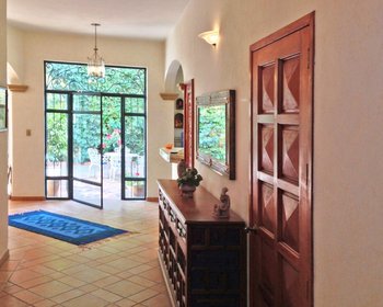 Casa Cul de Sac Serena is tucked on the same Privada next to Casa Cul de Sac Armonía, in the heart of San Miguel de Allende’s Centro. This residence offers the same exceptional blend of tranquility, craftsmanship, and classic colonial architecture as its sister home, yet with a touch more space and added charm. Its privileged location provides both privacy and walkability, making it a rare opportunity in one of the city’s most sought-after enclaves. Designed with intention, this two-bedroom, two-and-a-half-bathroom home welcomes you with warm, light-filled interiors and a layout that flows effortlessly from one space to the next. The open-concept living and dining areas, anchored by a gas fireplace, open fully through beautiful wrought-iron doors onto a lush patio framed by vibrant greenery, creating a perfect extension of the indoor living space. The well-appointed kitchen includes a pantry and opens to a second intimate patio, allowing soft natural light to stream in and offering a peaceful setting for morning coffee or casual entertaining. A half bath, coat closet, under-stair storage, and garage complete the functional main level. Upstairs, two generously sized bedrooms, each feature its own en-suite bathroom and ample closet space. The primary suite stands out with its private balcony terrace, surrounded by flourishing plants and ideal for enjoying morning sun or a quiet evening under the sky. A spacious office area on this floor provides additional flexibility for work, reading, or creative pursuits. The sunny rooftop, currently a blank canvas, offers unlimited potential. Whether envisioned as a gazebo-covered lounge, a firepit gathering area, or an outdoor dining space with a grill, the possibilities are endless. A true gem, this home beautifully marries peaceful living, solid construction, and extraordinary potential, all within an unbeatable Centro location on a private cul-de-sac.