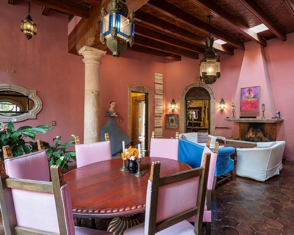 Casa Rosa: Tu Casa Colonial Española de Ensueño en San Miguel de Allende Bienvenido a Casa Rosa, una impresionante casa colonial española de 4 recámaras y 4.5 baños, ubicada en la muy cotizada zona del upper Centro. Situada en una esquina destacada, esta propiedad excepcional está a solo 5 minutos a pie del Jardín y la Parroquia, ofreciendo tanto comodidad como elegancia. Al ingresar, encontrarás un espacioso garaje y una acogedora recámara de huéspedes con su propio baño privado. Junto al garaje, una práctica área de lavandería con lavadora y secadora completa el nivel inferior, brindando tanto funcionalidad como comodidad. Al subir, sentirás de inmediato el encanto de Casa Rosa. La sala de estar te invita con su cálido ambiente, realzado por una gran chimenea central de Cantera que le da un toque de drama y calidez al espacio. Los relajantes sonidos de una fuente de agua de Cantera complementan aún más la atmósfera. La cocina, adyacente a la sala, es tanto encantadora como funcional, mientras que el amplio comedor y la acogedora sala de televisión brindan espacio suficiente para relajarse y entretener a tus invitados. Un elegante medio baño completa este piso, ofreciendo conveniencia adicional para los visitantes. La verdadera magia de la casa se despliega al ascender al cautivador patio, donde encontrarás una segunda recámara de huéspedes con su propio baño privado. Desde el patio, la vista se ve atraída de inmediato por la impresionante arquitectura colonial española, que presenta una cautivadora combinación de paredes rosas y piedra de Cantera de tono crema claro enmarcando ventanas y puertas. Este diseño elegante y raro agrega aún más atractivo atemporal a la propiedad. Unos pasos más arriba, descubrirás la recámara principal: un refugio sereno que ofrece un porche privado, un acogedor espacio de trabajo y un lujoso baño en suite. Otro conjunto de escaleras te llevará a la tercera recámara de huéspedes, donde el encanto colonial español se muestra en todo su esplendor, y el baño, con sus hermosos azulejos españoles, es tanto impresionante como cuidadosamente diseñado. Para disfrutar de las mejores vistas de la ciudad, asciende a la terraza de la azotea, donde serás obsequiado con vistas panorámicas de San Miguel de Allende y la icónica Parroquia. Es el espacio perfecto para disfrutar de los vibrantes atardeceres, las noches estrelladas o simplemente admirar el impresionante entorno. Cada recámara está equipada con unidades minisplit para calefacción y refrigeración, asegurando comodidad durante todo el año. Casa Rosa es la casa con la que has soñado: una impresionante mezcla de elegancia colonial española y conveniencia moderna, perfectamente ubicada a solo unos pasos del corazón de San Miguel de Allende.
