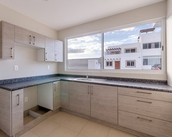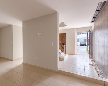El primer piso cuenta con una amplia sala de estar, comedor y un medio baño. La cocina estará equipada con estufa, horno y campana extractora a la hora de la entrega, a diferencia de lo visto en la imagen. El segundo piso tiene dos recamaras compartiendo un baño completo y la recamara principal con baño completo y su propio vestidor. La casa cuenta con dos estacionamientos descubiertos