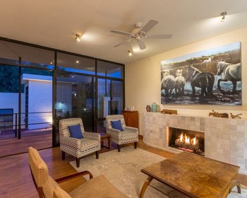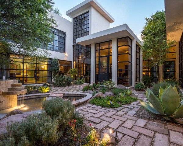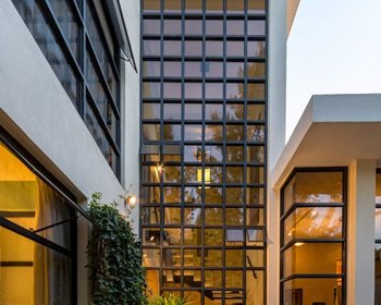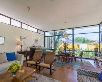 Aficionados a la arquitectura, cuidado: ¡esta joya de diseño resulta cautivadora desde la puerta de entrada! Evocando lo mejor de la arquitectura moderna de México, EE. UU. Y Europa, la casa concede un amable y obvio asentimiento a los maestros de la arquitectura Frank Lloyd Wright, Charles Rennie Macintosh, Ludwig Mies van der Rohe y Ricardo Legorreta. Nunca antes San Miguel ha sido testigo de un hogar con "ventanas giratorias" tan altas y grandiosas (el propio Wright acuñó la frase para un rincón de vidrio donde una columna normalmente se levantaría) que abre el hogar visualmente a los exuberantes jardines diseñados por Rob Johnson. La entrada reproduce la silla de escabel Hill House recogida en el museo de Macintosh, e incluso la sala de cristal de la azotea con vista a Parroquia, ideal para cócteles al atardecer, evoca el National Historic Landmark Farnsworth House, iluminado aquí para simular un efecto flotante.