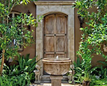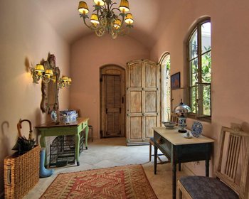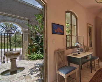 En el momento en que atraviesa el patio de entrada con la fuente que gotea hacia la entrada formal con antiguas puertas francesas con contraventanas, está rodeado de un estilo distintivo. Al ingresar a la sala de estar con techos dramáticamente altos, sus ojos se sentirán atraídos primero por las magníficas vistas de San Miguel a través del solárium y más allá del jardín, luego hacia adentro, a la chimenea de piedra caliza francesa de 200 años de antigüedad flanqueada por estanterías hechas a medida.