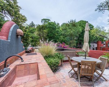 Desde el comedor se sale a una pequeña terraza que tiene una escalera de caracol que le conducirá a la terraza de arriba. Aquí podrá disfrutar de las vistas del Parque Juárez y de las hermosas grullas que anidan cerca.