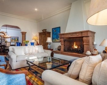 La sala tiene una gran chimenea y puertas de doble vidrio que se abre a una terraza con vista al suroeste y accede a una magnífica terraza cubierta con vista al centro San Miguel, el Parque Juárez, el Hotel Rosewood, el jardín y la piscina.