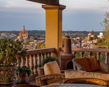 Desde esta habitación hay puertas dobles de vidrio a la terraza cubierta de gran tamaño donde se puede ver el atardecer o la luz del sol de la mañana bailar sobre la piedra rosa de la Parroquia, admirar los globos aerostáticos en lo alto o deleitarse con los fuegos artificiales en cada fiesta de San Miguel.