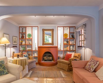 El comedor, junto a la encantadora cocina con azulejos, también se abre al patio al igual que las salas de estar de planta abierta.