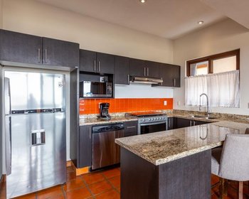 La cocina tiene sobres de granito y un desayunador para taburetes. Incluye electrodomésticos de acero inoxidable. Hay seis en total: lavavajillas, nevera, estufa y horno, microondas, lavadora y secadora.
