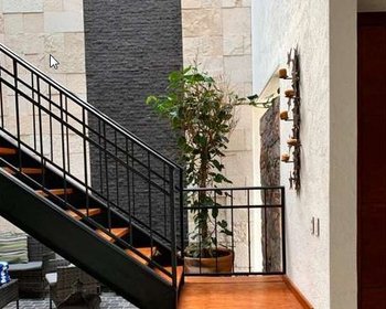 La luz natural entra a través de las ventanas de las puertas corredizas desde la sala de estar y el comedor, la cocina y desde el espacio abierto junto a la escalera donde hay una pared alta. El aire fresco y agradable llega desde esta área a toda la casa.