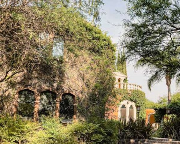 La parte central de la casa principal es de una sola planta y consta de una sala de estar Tudor con paneles de madera y chimenea, un amplio dormitorio principal con armarios para él y para ella y baño privado, una cocina, sala de desayuno, sala de televisión, madera biblioteca panelada y dos dormitorios de invitados, cada uno con baño en suite. Un par de escalones más arriba hay un pasillo que conduce a un garaje para dos autos, un lavadero y una bodega. Más allá del salón hay un gran comedor formal con un techo de bóveda de 24 pies de altura. Es servido por su propia cocina. Esta ala de la casa también contiene tres dormitorios de invitados, dos de los cuales comparten un baño y se abren a un balcón con vista al jacuzzi y al jardín para ocho personas. El dormitorio del primer piso también tiene vista al jardín y baño privado. La casa principal tiene un total de seis chimeneas de cantera, dos fuentes interiores y siete techos de bóveda.