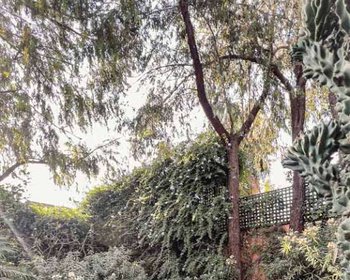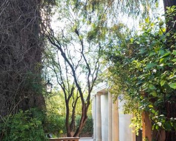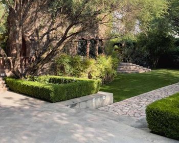 Los terrenos alrededor del edificio contienen sinuosos caminos pavimentados, pérgolas cubiertas de enredaderas, nueve fuentes, un jacuzzi climatizado, varios patios y porches y una terraza en la azotea con asientos cubiertos al estilo de un antiguo templo romano que ofrece vistas al atardecer.< /p>