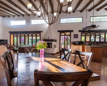 La casa es de una sola planta, al ingresar ofrece un espacio abierto que alberga la vida sala, cocina y comedor. Su techo de doble altura con varias ventanas lo hace muy luminoso. Frente al salón hay unas puertas abatibles que permiten unirse con la terraza, pudiendo integrar ambos espacios.