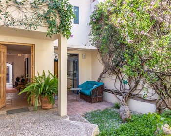 Dos patios al aire libre, uno con muro de agua, brindan serenidad y vistas al jardín a la espaciosa sala, al comedor ya la cocina con azulejos de Talavera y su terraza para el desayuno. El segundo piso cuenta con dos dormitorios, cada uno con baño privado en suite, con otro baño de visitas en la planta baja. El tercer dormitorio, que podría ser su suite principal, está sobre el área de la sala de estar, separado por un patio.