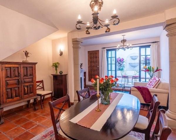 Planta baja: cocina pequeña pero muy funcional, tocador y un plan abierto: comedor, sala de estar, chimenea de gas y una pared de vidrio que se abre al patio con fuente.