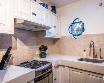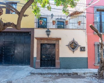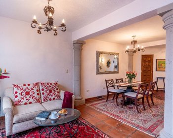 La casa tiene un espacio al aire libre en cada nivel: un patio con fuente junto a la sala de estar, un pequeño balcón junto a la oficina/sala de estar del segundo piso y una hermosa terraza muy privada en la azotea con vistas.