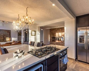La pieza central de la cocina es una isla de generosas dimensiones, un escenario perfecto para preparar comidas mientras se entretiene con sus invitados. Bañada por la luz natural, este paraíso culinario tiene vistas al amplio patio trasero.