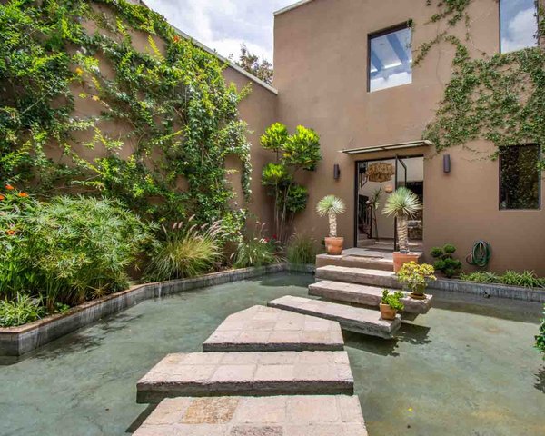 Casa Paloma – Elegancia Arquitectónica en Atascadero En la codiciada calle Paloma, que conduce directamente al reconocido Jardín Botánico de San Miguel de Allende, se encuentra Casa Paloma, una residencia que combina la elegancia contemporánea con el encanto colonial en perfecta armonía. Ubicada en un amplio terreno de 600 m², esta excepcional casa le da la bienvenida con una experiencia inolvidable: escalones de piedra flotan sobre un tranquilo estanque reflectante, enmarcado por una exuberante vegetación que trepa por las paredes, guiándolo hacia una imponente entrada de doble altura con dramáticos detalles en piedra. Esta fusión de agua, luz y textura crea una atmósfera de serenidad y grandeza desde el primer momento. La planta principal ofrece una soleada sala de estar y comedor, un elegante tocador y una espaciosa suite principal con chimenea de gas, amplio vestidor, tocador doble, bañera profunda y una impresionante ducha con mampara de cristal que ofrece vistas panorámicas al jardín: un verdadero refugio tipo spa. Una cocina de chef con abundante espacio de encimera se integra con un comedor formal, un acogedor desayunador y una versátil sala de estar o de televisión. En la planta superior, una amplia oficina de planta abierta, ideal como estudio de arte o espacio creativo, se conecta con un dormitorio de invitados con baño en suite. Todas las habitaciones de la casa ofrecen vistas a los jardines paisajísticos circundantes, ofreciendo luz y privacidad a partes iguales. El terreno incluye una encantadora fuente con potencial para transformarse en una pequeña piscina. El amplio terreno también permite la adición de más habitaciones o servicios. Un garaje seguro con puerta eléctrica añade comodidad y tranquilidad, completando el atractivo de la propiedad. Casa Paloma es más que un hogar: es una muestra de estilo de vida refinado en uno de los barrios más codiciados de San Miguel.
