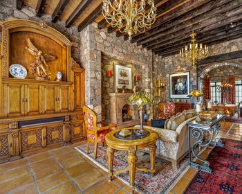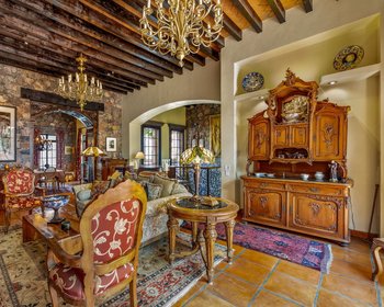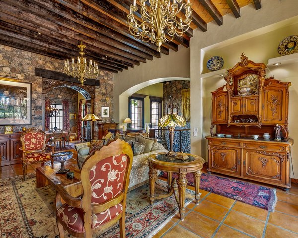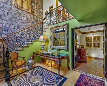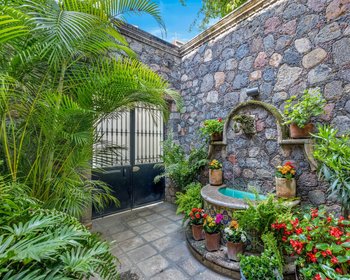 You enter Casa Flora through a graceful foyer, where a stone fountain and hand-crafted details set the tone for the home. From here, an anteroom provides access to the private quarters. The master suite is especially impressive, with carved wood accents, a cantera fireplace, and air conditioning for year-round comfort. Glass doors open to a garden and patio with another fountain and a covered seating area — ideal for enjoying the outdoors in privacy. The en-suite bathroom features high end finishes, including matching circular mirrors over dual sinks, and a spacious walk-in closet. Abundant natural light fills the space throughout the day. The guest bedroom offers its own en-suite bathroom and bright windows, making it comfortable for family or visitors. A laundry room is conveniently located off the anteroom. From the anteroom, a short staircase leads up to the main living level. The kitchen features granite countertops, high-end appliances, a large island, and hand-carved cabinetry. Adjacent is a terrace perfect for dining al fresco or enjoying evening cocktails. The formal living room centers around a grand cantera fireplace, complemented by a impressive custom cabinet built by a local master craftsman, two elegant chandeliers, and a grand piano. A formal dining room extends from the living area, offering a refined space for entertaining. From the kitchen terrace, stairs lead down to the back garden, where the sound of the fountain carries through the air. This level also includes a guest bathroom. Another short flight of stairs brings you to a second terrace with a sitting area and sweeping views. On this level you’ll also find a thoughtfully designed office with custom cabinetry and its own full bath. The office opens to yet another patio and could easily serve as a third bedroom if desired. From the upper terrace, a spiral staircase leads to a rooftop with panoramic views of the Parroquia and the surrounding hills. Casa Flora also offers modern conveniences and upgrades that enhance its livability. The home is equipped with eight solar panels for energy efficiency, a whole-house water purification and pressurization system, and mini-split air conditioning units. Casa Flora is offered with a carefully curated furniture package, including fine furnishings and antiques of exceptional quality. This turnkey offering allows new owners to step directly into a beautifully finished home, ready to be enjoyed from day one.