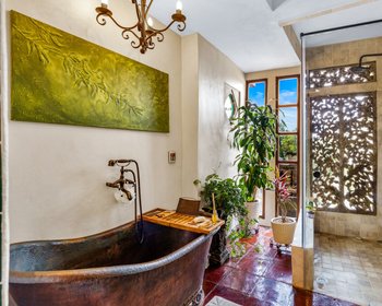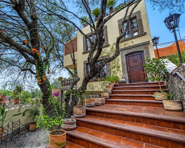 Ubicada en una tranquila comunidad cerrada de solo siete casas, justo en el borde del Centro, esta joya de estilo colonial combina el encanto tradicional con toques modernos y mucho carácter. Desde la calle, te recibe un majestuoso árbol de mezquite que enmarca la entrada principal con una presencia imponente. Al entrar, encontrarás la recámara principal en la planta baja, equipada con su propia chimenea de cantera a gas, vestidor, un baño espectacular con regadera y tina de cobre, además de una terraza cubierta privada—ideal para relajarse en las mañanas o disfrutar la tarde. Subiendo al segundo nivel, te espera un espacio de concepto abierto que integra cocina, comedor y sala. La cocina está completamente equipada con cubiertas de mármol, isla de cocción y todo lo necesario para cocinar con estilo. Los pisos de barro rojo, otra chimenea de cantera, y detalles artesanales le dan un toque cálido y auténtico. Desde la sala se accede a una terraza techada con vistas impresionantes al centro de San Miguel de Allende y a las montañas de Guanajuato al fondo—perfecta para el café al amanecer o una copa de vino al atardecer. En el tercer nivel, una terraza abierta pero techada ofrece el espacio ideal para entretener invitados o disfrutar la puesta de sol. También puede adaptarse fácilmente como una tercera recámara si se desea. Frente a la casa principal, cruzando el patio, se encuentra una casita completamente independiente, con baño completo en suite—perfecta para visitas o incluso como opción de renta. El patio central está adornado con un imponente muro de piedra y una fuente tipo cascada que aporta una atmósfera serena y encantadora. ¿Extras? Una cava para vinos y un sauna privado para relajarte como se debe. También cuenta con estacionamiento privado para un auto. Si buscas un refugio lleno de personalidad, a solo minutos del corazón vibrante del Centro de San Miguel, esta propiedad única podría ser justo lo que estás buscando.