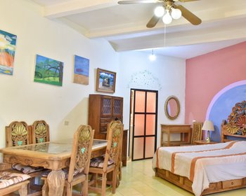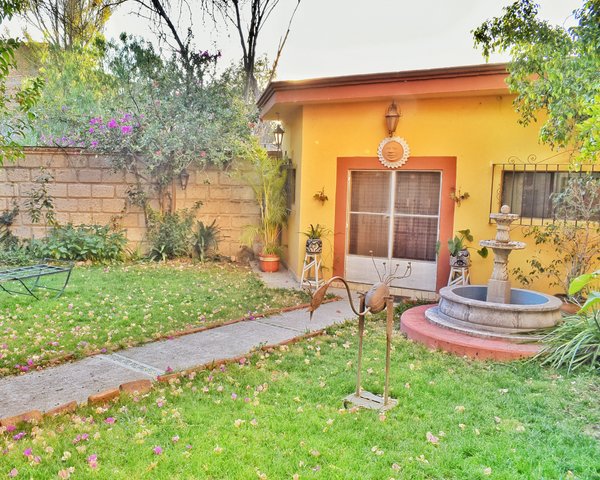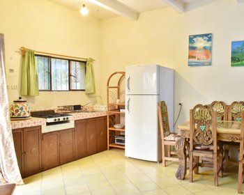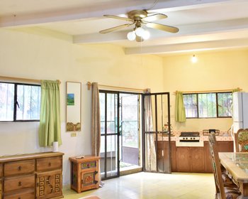 The cozy guest house at the rear, offers an ample space, all in one, with kitchen, dining room, living room, and bedroom, combined in a functional home perfect for a single person. It has a full bathroom, and it is plenty of light. The garden around The Casita is part of the common areas as well as the Veranda.