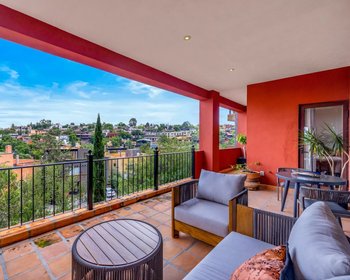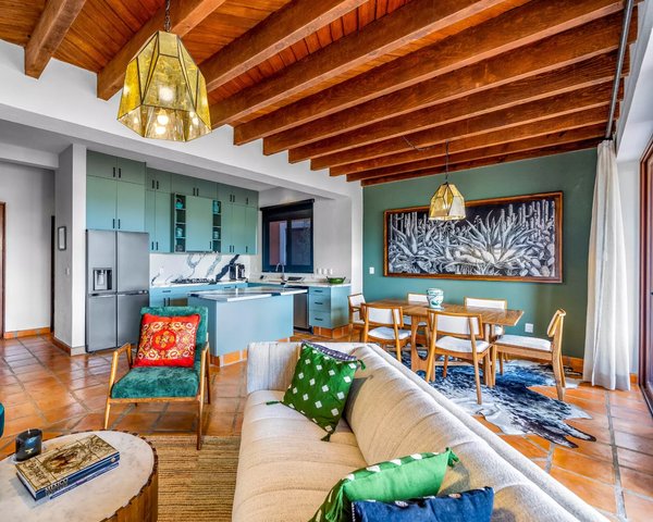 Would you like to see a condo for sale in Capilla de Piedra? This beautiful condo has been recently remodeled, featuring a unique kitchen with a white marble bar and countertops, a solid wood custom kitchen with spacious and well-distributed cabinets, included appliances, and a distinctive agave-green design that brings freshness and life to the space. It is located on a cool level, two floors below the main street access, yet it offers spectacular views of the Atascadero that you can enjoy from the living-dining room and its large covered terrace. The living and dining areas feature clay floors, wooden ceilings, and a gas fireplace. The condo offers two bedrooms, each with a full bathroom, while the primary bedroom includes a closet and direct access to the terrace. There is also a half bathroom for guests with a linen closet and a laundry area. It is located within the exclusive Capilla de Piedra development, just a few minutes’ walk from the historic downtown (the walk uphill is steep but manageable). The development offers a swimming pool, gym, jacuzzi, terrace, multipurpose room, tennis courts, controlled access, shuttle service to downtown, and organized waste disposal areas. The sale price is $8,100,000 MXN and includes furniture, with some decorative exclusions. An excellent option either for living or as an investment in San Miguel de Allende.