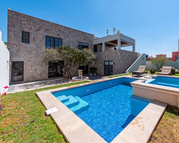 Casa Veralia is a dream home within the much-coveted, gated community of Vista Antigua. It is a spacious, three-bedroom house with a ground floor Master bedroom with a Queen bed that opens up to the patio and pool area. The impressive living room has a double height ceiling with a magnificeht fixture, and it meets the dining room and kitchen with a comfortable flow into the patio area, where a 300-year-old garambullo tree attracts hummingbirds and other local birds every morning. The second floor contains an open studio or TV room, and two ensuite bedrooms with a Queen bed and bunk beds. Additionally, there is a maid's room and bathroom.