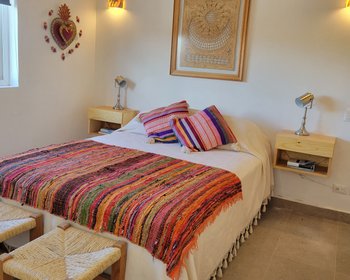 Bedroom features queen bed, Mexican art and a wall of warm, Mexican pine hand-crafted closets and