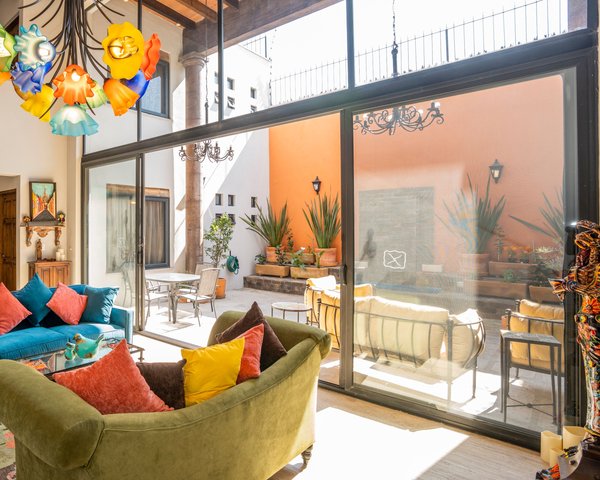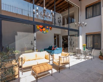 4 outdoor living spaces, including entry, 1st floor patio with fountain, 2nd floor outdoor seating, and rooftop terraza.