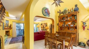 Inside, vibrant Mexican art and handcrafted details create a joyful atmosphere filled with color and tradition. The fully equipped kitchen is ideal for cooking and entertaining, while the open living area with a tranquil fountain invites you to relax and unwind.