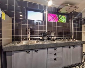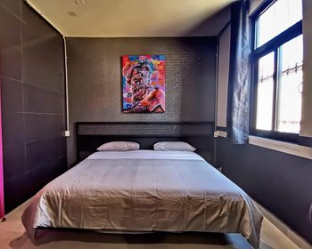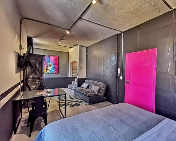 This charming studio apartment blends modern industrial design with bold, colorful accents. Ideally located in the city center, it comes fully equipped with a double bed, futon-style sofa, dining area, spacious wardrobe, flat-screen TV, and unique decorative touches. Natural light and an open layout make it a perfect choice for travelers, couples, or professionals looking to stay in the vibrant heart of the city in comfort and style.