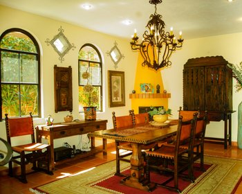 Dining room and sala/TV area with a cozy fireplace and soft textures to invite you to relax reading your favorite book.