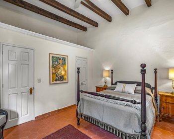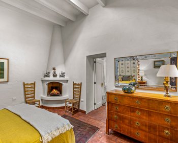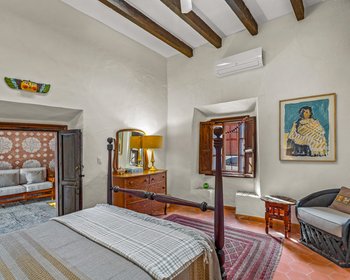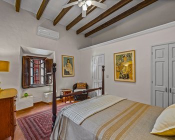Architecturally, the home is truly special. The initial and most significant upgrades were carried out by renowned architect Teresa Wachter, whose vision transformed the property. Her work includes the creation of three stunning bóveda ceilings, the raising of all rooflines for enhanced privacy, and the design of the impressive round brick pillars supporting the upper veranda—whose roof was completely rebuilt to a much higher standard. Teresa also conceived the decorative tile trim around all windows and doors, the scalloped roofline tiles, the delicate lace brickwork, the two front fountains, and the striking mesquite French doors in the living room, which anchor the home with warmth and character.