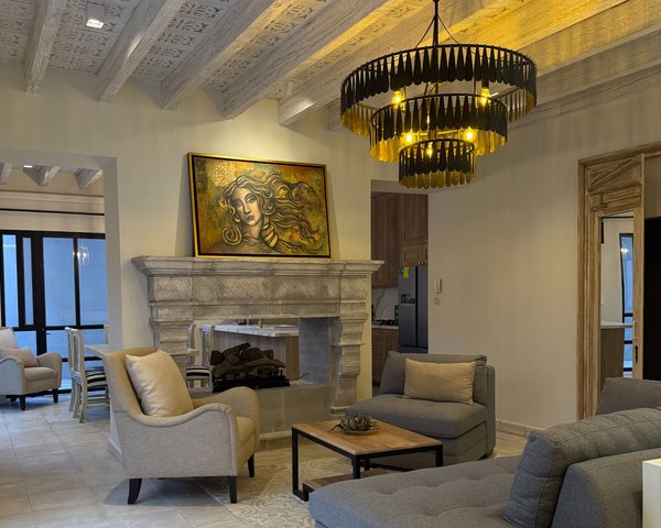 A Signature New Construction by Espacio Doce — San Miguel’s Premier Luxury Home BuilderThis exceptional newly built luxury residence by Espacio Doce sets a new benchmark for refined living in San Miguel de Allende. Designed to impress at every turn, the home blends timeless architectural elegance with modern sophistication, offering dramatic volumes, abundant natural light, and impeccably curated spaces across three levels—crowned by a breathtaking rooftop terrace.From the moment you arrive, the home’s elegant colonial-inspired façade commands attention, featuring cantera stone accents, wrought-iron balconies, and oversized windows that hint at the light-filled interiors within. A private garage and discreet entry add both convenience and curb appeal.Property Highlights • 4 Bedrooms • 4 Full Bathrooms + 2 Half Baths • 3 Fireplaces • 2 Balconies with 7-foot windows • 14-foot ceilings • Guest suite with kitchenette • Laundry room plus maid’s closet • Central air conditioning • Central courtyard with a historic tree • Terrace off the primary suite • Rooftop kitchenette & rooftop half bath • LED-illuminated exterior stairwells to the rooftopFirst Level – Seamless Indoor–Outdoor LivingThe first floor is designed for effortless entertaining and everyday luxury. An open-concept kitchen and dining area opens through expansive glass doors to a tranquil patio and central courtyard, creating a seamless indoor–outdoor experience ideal for San Miguel’s year-round climate.The kitchen features custom cabinetry, premium finishes, and a generous island, flowing into a sophisticated living area anchored by a striking fireplace. This level also includes a powder room, garage access, laundry area, and a private guest suite with full bath and kitchenette—perfect for visitors, multigenerational living, or independent rental income.Second Level – Private RetreatsThe second floor hosts three spacious en-suite bedrooms, each designed as a private sanctuary. One suite enjoys a private terrace with parish views, another features a street-facing balcony, and the third opens to an interior patio, ensuring exceptional natural light, ventilation, and a sense of calm throughout. The primary suite is further elevated by its own private terrace, creating a peaceful escape above the city.Third Level – Rooftop Living at Its FinestAt the crown of the home, a spectacular rooftop terrace delivers panoramic views of San Miguel de Allende and the iconic parishes of San Miguel Arcángel and San Antonio. Complete with a rooftop kitchenette, half bath, and LED-lit stair access, this space is perfectly suited for sunset cocktails, elegant gatherings, or relaxed evenings under the stars.