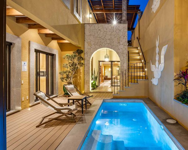 Step into the timeless charm of San Miguel de Allende, thoughtfully reimagined for modern luxury. This extraordinary residence is ideally located just a short five-minute walk from the main square and only moments from the iconic Parroquia, placing you in the very heart of Centro while still offering a sense of privacy and serenity that is increasingly rare. Completely built from the ground up on the historic site of the beloved “La Purísima” bakery, the home honors its past while delivering a refined, contemporary lifestyle designed for comfort and elegance.From the moment you enter, a graceful foyer sets the tone with clean architectural lines, soft colonial finishes, and exquisite cantera stone details that flow seamlessly throughout the entire property. The living room is positioned at the entrance and has been carefully designed with a concealed, wall-mounted television, preserving the aesthetic beauty of the space while incorporating modern convenience. The residence is offered fully furnished, curated with tasteful pieces that complement the home’s character and allow for an effortless move-in experience.The kitchen is both elegant and highly functional, fully equipped with modern appliances and seamlessly integrated into a bright, open-concept dining area designed for comfortable entertaining. This level also includes a refined powder room. A standout feature of the first floor is the heated swimming pool with counter-current system, complemented by a dedicated lounge area that creates a private, resort-like atmosphere for year-round enjoyment. Adjacent to the pool, and accessed via a staircase, an outdoor terrace provides an exceptional entertaining space, featuring a built-in gas grill and a dining area thoughtfully appointed to host gatherings with ease.Single-level living in Centro is a rare and highly desirable feature, and this residence offers it beautifully. The home includes three generously sized bedrooms, all equipped with mini-split systems providing both air conditioning and heating. One bedroom features a comfortable sitting area with direct access to the swimming pool. In addition to its en-suite bathroom, this bedroom also offers a private outdoor shower, enhancing the indoor–outdoor living experience.The upper level continues the home’s emphasis on comfort and refinement, featuring 2 well-appointed bedrooms, each with an en-suite bathroom, ample closet space, and thoughtfully designed details that enhance privacy and relaxation. One of the bedrooms opens onto a private balcony overlooking the pool area, adding an intimate outdoor retreat and an elegant architectural element. The second en-suite bedroom on this level is generously proportioned and accommodates two queen-size beds, offering dual sinks and a bathtub in the bathroom. A conveniently located laundry room completes this level, providing everyday functionality while keeping service areas discreetly separate from the home’s main social spaces.Crowning the home is a spectacular rooftop terrace — undoubtedly one of the property’s most captivating highlights. From this elevated vantage point, breathtaking, unobstructed views of the Parroquia create a dramatic and unforgettable backdrop. The rooftop is designed for both relaxation and social gatherings, featuring an outdoor lounge area and a propane fireplace that brings warmth and ambiance to evenings under the San Miguel sky.Every corner of this residence reflects meticulous attention to detail, from sustainable design elements and high-quality materials to the timeless beauty of cantera stone accents and a layout that maximizes natural light with fluid transitions between spaces. This is more than a home — it is a lifestyle property that captures the essence of San Miguel living: walkable, elegant, vibrant, and deeply inviting. A rare opportunity to own a fully realized sanctuary in one of the most desirable and historic locations in the city.