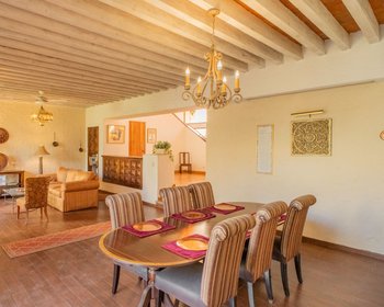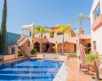The Oasis in Los Frailes is an estate designed for indoor–outdoor living and effortless entertaining. The fountain entry sets the tone, opening into a home with high ceilings throughout, traditional wood beams, and bóveda ceilings, along with multiple gathering zones that let everyone spread out comfortably.The main level is anchored by the primary bedroom and living spaces—foyer, fully-equipped kitchen, breakfast room, dining, living room with fireplace, plus a large courtyard that connects you to the outdoor lifestyle San Miguel is known for. The pool courtyard is the heart of the property, complemented by a grill and outdoor kitchen area, yard with a fountain and an outdoor fireplace, generous terraces, and mature landscaping. Practical touches include multiple bodegas/storage, a linen closet, a dedicated service area, and a 2-car electric garage with additional storage.The layout is ideal for large families and hosting: a primary suite on the first floor, four additional bedrooms upstairs, plus a service bedroom and three independent guest rooms, all with en suite bathrooms. Select rooms include mini-split A/C (not all). A home with scale, privacy, and the right bones for a standout Los Frailes listing.