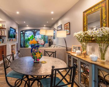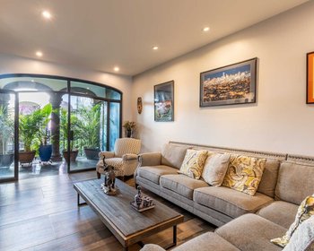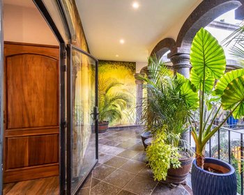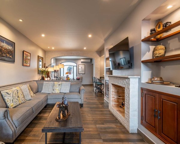 Quebrada Condo is located a few blocks away from the main square. It is part of a three-level property, located on the second floor with stairs or an elevator to get you there. This apartment has really good quality construction and finishes.The social area has an open layout between the living room, dining room and kitchen. The living room has a fireplace and connects to the interior terrace. This terrace is marvelous; it has a mural painting all over the walls which transports you from sunrise to the sunset and night. The kitchen has a marble bar and lots of storage.The apartment has two bedrooms, each one with a fireplace and a full bathroom. The master bedroom has a walking closet and a hot tub in the bathroom.