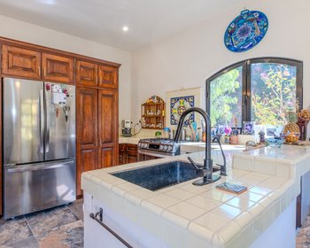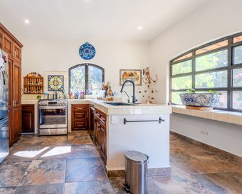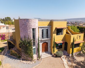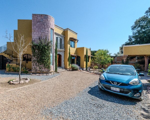 Enclosed within garden walls and set on a generous landscaped lot, this new colonial-style home offers privacy, charm, and flexible living spaces throughout. A cantera-framed entryway with a balcony above welcomes you inside to an inviting foyer, where built-in display niches create an elegant spot for art.To the right, the dining room flows into an open kitchen, creating a comfortable space for everyday living and entertaining. Beyond, a spacious living room centered on a cantera fireplace opens to the back patio, bringing in natural light and strengthening the connection to the garden.The ground floor features a generously sized primary suite with a full en-suite bath with bathtub, along with extensive custom wood cabinetry providing abundant storage and closet space. This level also includes a guest half bath, an artist’s studio, and a laundry room with direct access to the garden.A bright stairway off the entry, illuminated by a tall window, leads to the second floor, which functions well as an independent living area. This level includes a sitting area with a kitchenette, access to a side patio, and a small Romeo-and-Juliet balcony. There are two bedrooms: one with a full en-suite bath, and a second bedroom served by a full bath located next door that can also be shared with guests. Both rooms enjoy large windows, good light, and generous storage. The upper level also has its own exterior stair access, offering excellent flexibility for guests, extended family, or rental use.From this floor, a stairway leads to the rooftop terrace, where spectacular views of San Miguel de Allende and the surrounding mountains create a standout feature of the home.In the garden, a large covered outdoor structure supported by four cantera columns provides a beautiful shaded space currently used for outdoor dining, though it could also function as a carport.The home is equipped with six solar panels and four mini-split air-conditioning units that provide both heating and cooling, adding modern efficiency to its traditional character. It also includes two cisterns — one for rainwater capture and another for city water — providing added reliability and water management.