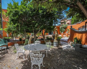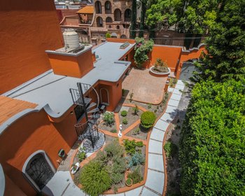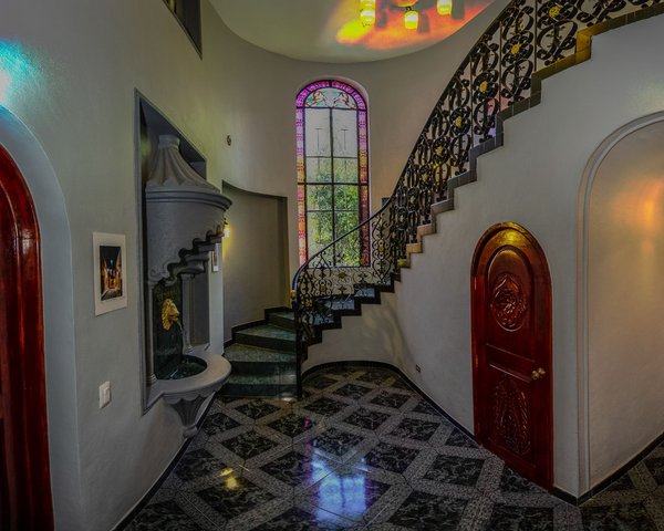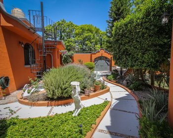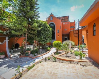 Welcome to this majestic residence, highlighted by a striking wrought-iron staircase, vibrant stained-glass windows, and refined stone finishes throughout. The home features a gourmet granite kitchen and custom closets adorned with exquisite hand-carved wooden doors, complemented by graceful fountains both indoors and outdoors. One bedroom is conveniently located on the ground floor, while two additional bedrooms occupy the upper level. Crowning the home is a covered rooftop terrace offering breathtaking mountain views. At the front of the property, a spacious and lush garden unfolds with fruit trees, flowering plants, and aromatic herbs, creating a serene outdoor retreat. A shaded seating area, framed by elegant white Mediterranean-style statues, invites relaxation. Adding exceptional versatility, the property also includes a fully independent casita-style apartment featuring one bedroom, kitchen, dining area, living room, and a private terrace.