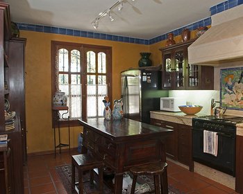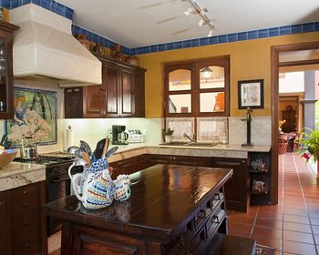 To the right side of the central patio are the kitchen, formal dining room, and formal living room. The dining room and living room both have tzalam wood flooring and French doors that open to the courtyard.