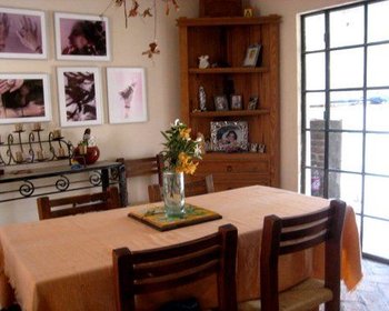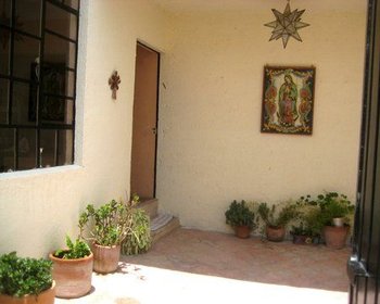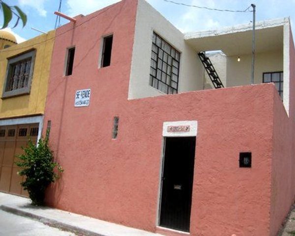 This 2 bedroom 1.5 bathroom home is in a working class neighborhood in the colonia of Olimpo. It is situated on a double lot on the corner stretching from street to street. One enters the Garage from one side of the property, and the main entrance is on the next street, with a garden area between the garage and the house. Down stairs has a 1/2 bath kitchen, living room, dining room, and laundry area. Upstairs there are two bedrooms with good size closets, and a shared bath. It is a 25 minute walk to town, buses are within a few blocks, and by car there is easy access to the libramiento.