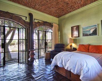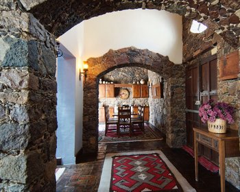 The main house was built following the design of an old Mexican mansion, with deep foundation, heavy duty wiring and plumbing, stone walls and arches, high ceilings with bovedas, clay floors, and was designed to have very good natural light. It has: an ample master bedroom with a full bath, boveda ceiling, direct access and views to the garden; a very practical and functional kitchen decorated with Mexican tiles, with lots of cabinets to provide a big storage space; a cozy dining room with boveda ceiling and stone walls; large and elegant living room with access to the garden, boveda ceiling, Rumford fireplace, designed for burning wood far more efficiently and exhausting much more effectively than regular fireplaces.