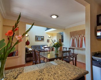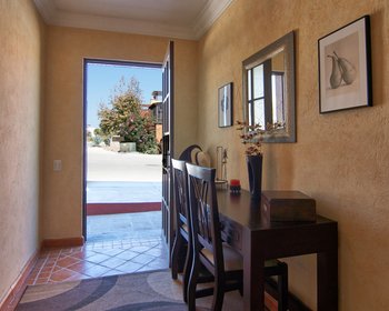 As you enter this home, you'll notice that the faux finish paint provides a rich, warm depth to all the rooms. The living room is particularly inviting, as the vaulted ceiling allows for two levels of windows that bring in much welcomed sunshine. Shallow rectangular nichos, a contemporary take on the traditional arched nicho, create the perfect spot to highlight a special piece of art or flower arrangement.