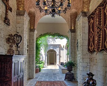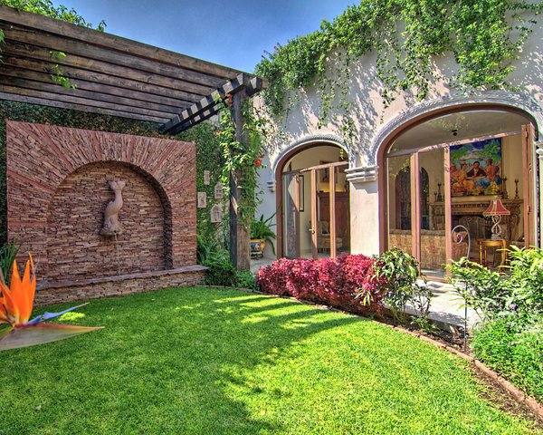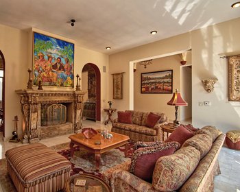 Take one step into the entryway of the property and you'll know exactly what I'm talking about. The 15 foot, brick, barrel vault boveda ceiling, hand hewn rock walls and adoquin stone flooring welcome you with great fanfare. Follow this passageway through the arched doorway and you'll find yourself in the picturesque outdoor sala. Have a seat, and take it all in: the verdant lawn, lush greenery, the gentle splash of the fountain, and the serenity of the azure koi pond. Within the sala itself, you'll be enthralled by the fireplace, a replica of a Tuscan design featuring Neptune and his mouth of fire. Skylights, custom chandeliers and cantera nichos also decorate the area. The seamless integration of this indoor/outdoor space creates the possibility for intimate evenings by the fire as well as large garden parties and everything in between.