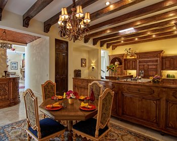 In front of the kitchen is a cozy sitting area which faces a custom cabinet that discretely houses a t.v. There's also a breakfast area large enough to seat six. Decorative accents include a wood beamed ceiling and built in nichos and shelving. The bar, also located in front of the kitchen, includes a wine refrigerator and is highlighted by gorgeous hand-painted tiles, more intricately tooled woodwork and a boveda overhead. To help you keep your cookbooks, recipes and household work in order, there's also a small office with custom shelves and desk.