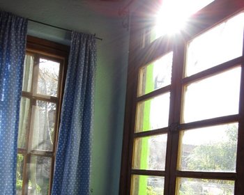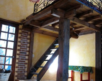 The colourful guesthouse is a remodeled old variety shop. It is 60 m2 of brick and stone construction, with Mexican tile and ppolished cement tile floors, antique doors and windows, antique clay tile roofing, high wooden ceilings, loft bed, charming kitchen, Mesquite details, working fireplace, dry toilet, shower, large hot water heater, large patio and parking area.
