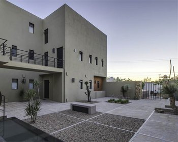 With abundant natural light throughout, high ceilings and generous living spaces, Residencial Chimal is a perfect combination of function, style and ease of living. On the main level, the kitchen with granite counters opens onto a double height living/dining room with fireplace, oversize windows framing the Picacho Mountains and glass doors extending to a generous patio. On the same level is a half bath off the kitchen and a large bedroom with glass doors to access the patio, bamboo wood floors, large closet and en-suite marble bathroom.