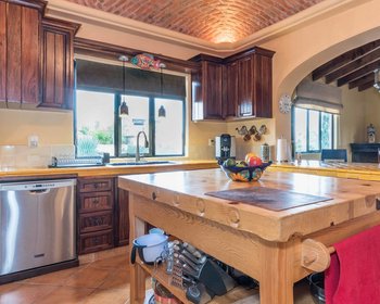 The kitchen has wooden finishes combined with talavera tile and a large working island perfect for kitchen lovers.