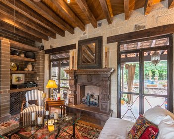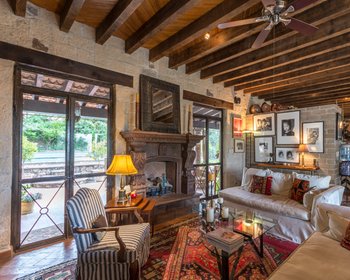 Entering through the front garden & up wide monastery style stairs to the Loggia one then enters into a Large Dramatic Open Living Plan including the principal Sala, a Grand Kitchen & secluded Dining Room. This area w/Classic Beamed and Boveda Ceilings & Cantera Carved fireplaces in both the Sala & Dining Rooms & Brick Floors throughout open onto both the front & back Loggias.