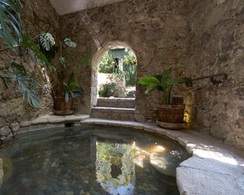 Stroll though the winding paths of the magical garden, designed and maintained by famous landscape architect Timoteo Wachtel and you will find local plants like "hoja santa" (holy leaf), and trees laden with pomegranates, limes, oranges, pears, peaches, and other fruits.The "secret garden" has banana trees, a fountain and a grill. Continue to the natural stone hot tub surrounded by 16th century walls and a stone "waterfall" where water lands in a small pool filled with aquatic plants..
