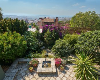 The stairwell, with sliding glass roof where sunlight pours in, leads you to the second story where the dining room opens onto an ample terrace where you can sit to have a glass of wine or a lazy Sunday morning brunch overlooking the views that made San Miguel famous. The main living room, the Master bedroom and bath enjoy the same view of lush gardens.